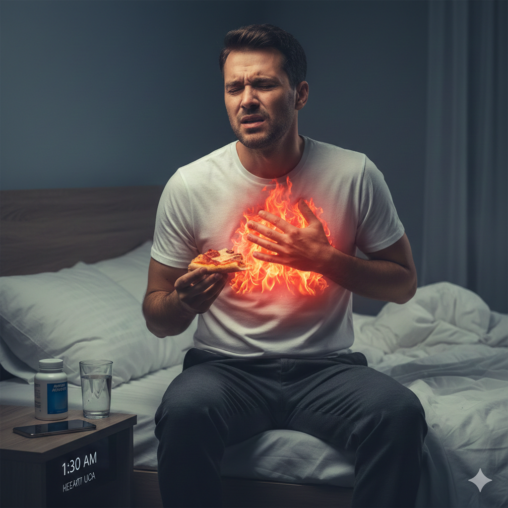• حرقة الصدر: شعور بالحرقان خلف عظمة الصدر، وغالباً ما يزداد سوءاً بعد الأكل أو عند الاستلقاء.